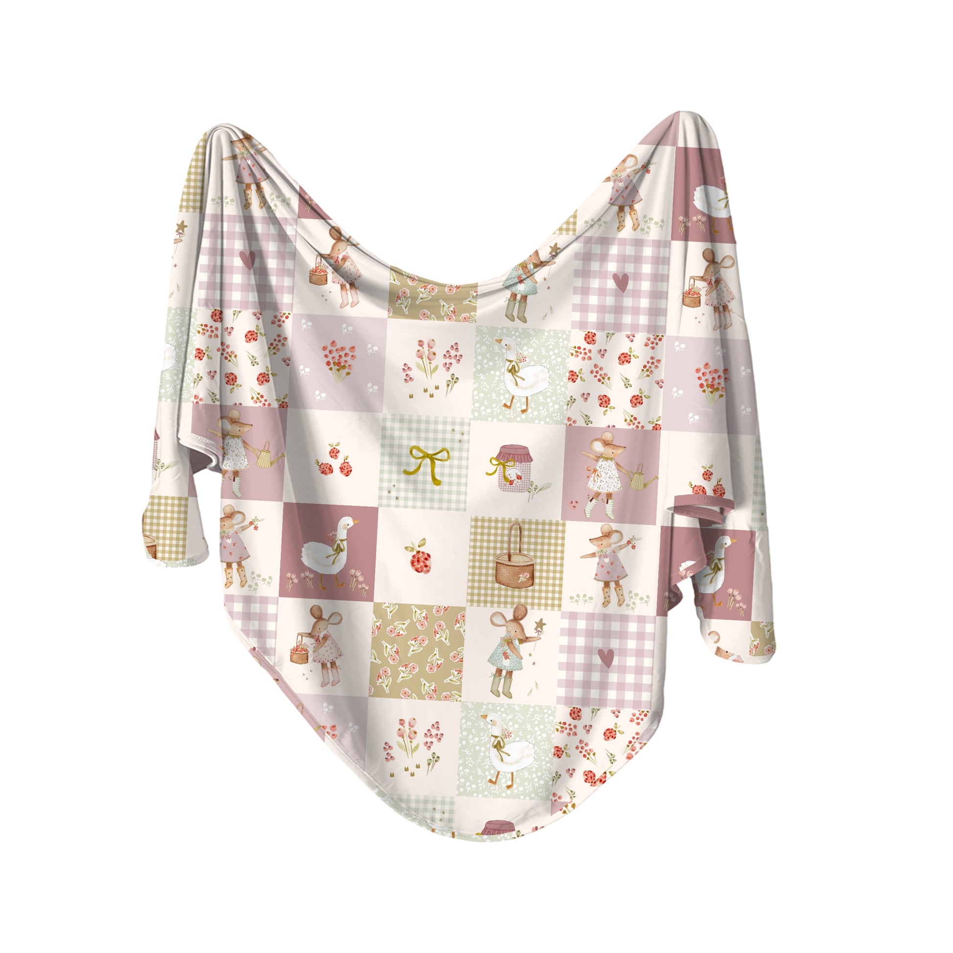 A sweet patchwork-inspired print blends soft blush, cream, and sage tones with charming storybook motifs, delicate florals, and classic gingham details. The whimsical design creates a timeless, cozy look that feels both playful and beautifully nostalgic.