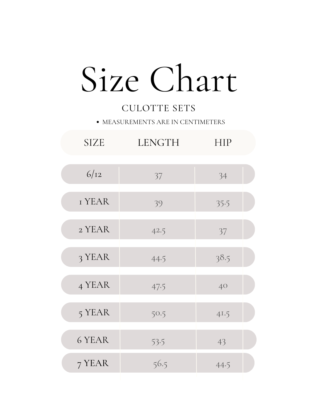 Introducing our newest fit for your little one— the culotte set! Still our buttery soft bamboo material for your perfect for everyday wear. these culottes offer a versatile style: true to size, they fit as culottes, while sizing up gives a longer, regular pant fit. Laney’s favorite way to style them for her daughters is as culottes.