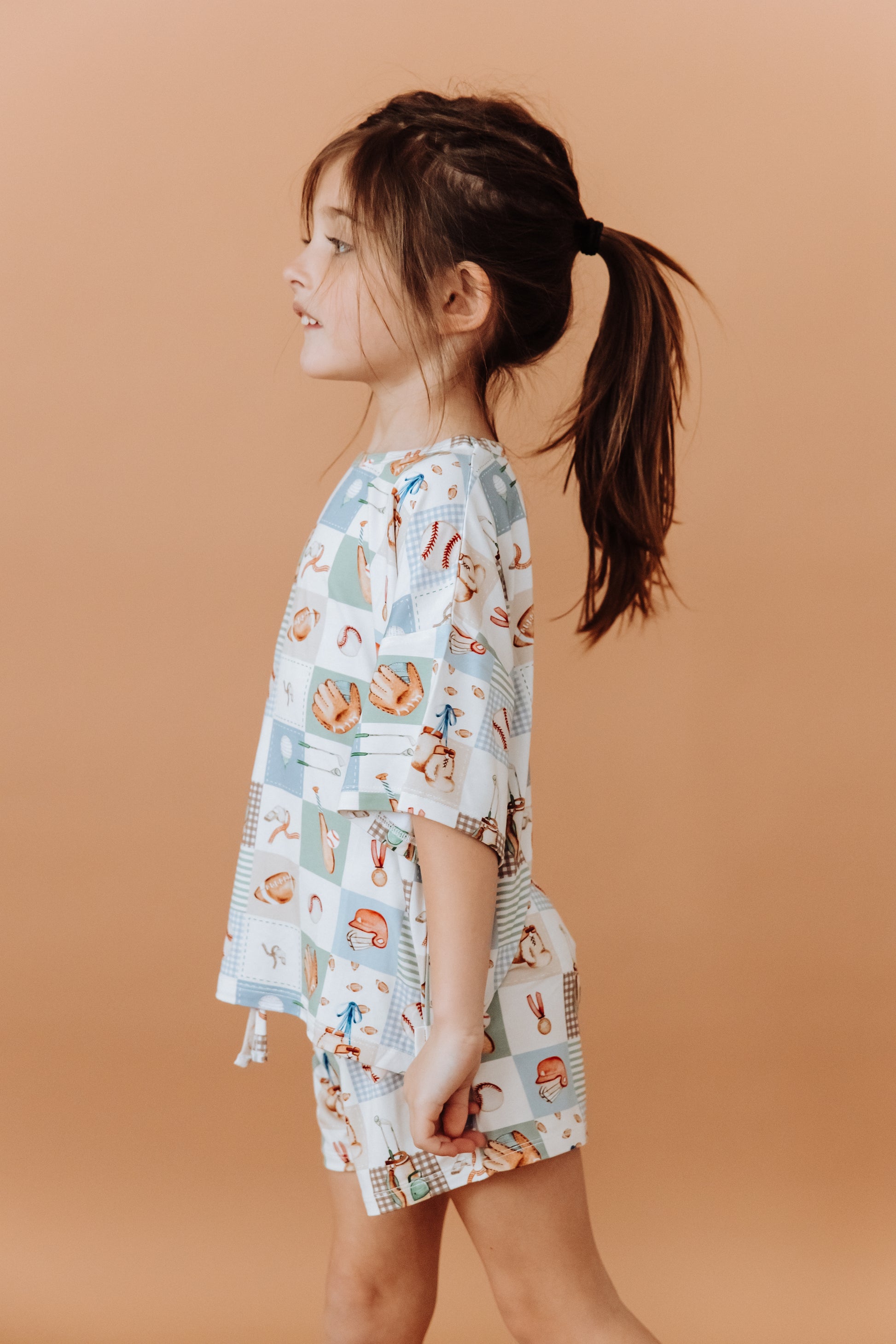 A nostalgic patchwork print filled with tiny baseball gloves, bats, caps, golf, football and little game-day treasures. Soft blues, warm browns, and gentle neutrals give it a vintage, heirloom feel—perfect for little ones who love sunny days, backyard catches, and ballpark memories. ⚾️